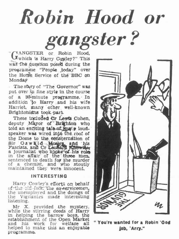 BOWLER-HATTED and bow-tied chairman of Brighton’s Upper Gardner-street Traders’ Association Harry Cowley (“The Guv’nor”) warned members of the association at a meeting in the City of London public house in London-street, Brighton, that they would be in danger of losing their trading licences if they did not “play the game” and support him in enforcing the trading rules.